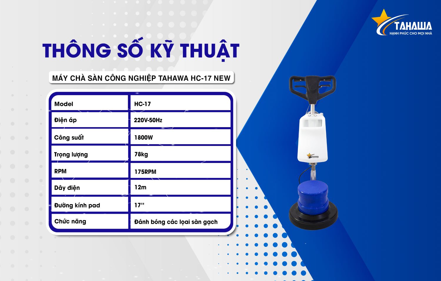Máy chà sàn Tahawa HC-17 NEW là một trong những sản phẩm đáng tin cậy nhất trên thị trường hiện nay. Với công suất 1800W, đường kính pad 17'', tốc độ RPM 175, và dây điện dài 12m, máy chà sàn Tahawa HC-17 NEW mang lại khả năng chà sàn vượt trội cho các khu vực sàn nhà xưởng và những không gian rộng lớn khác.