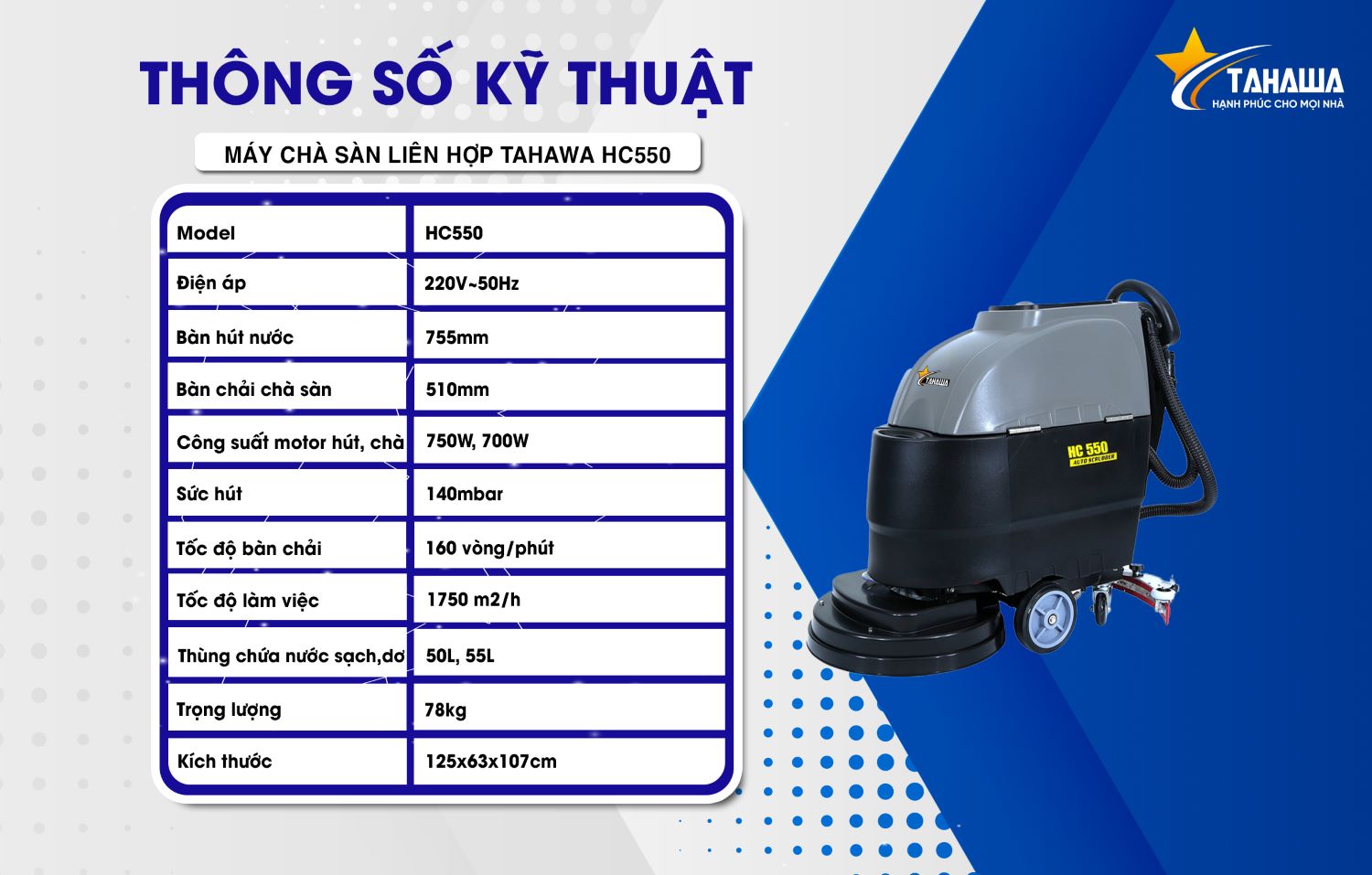 Máy chà sàn liên hợp Tahawa HC550 – Giải pháp vệ sinh sàn công nghiệp hiệu quả và tiện lợi
