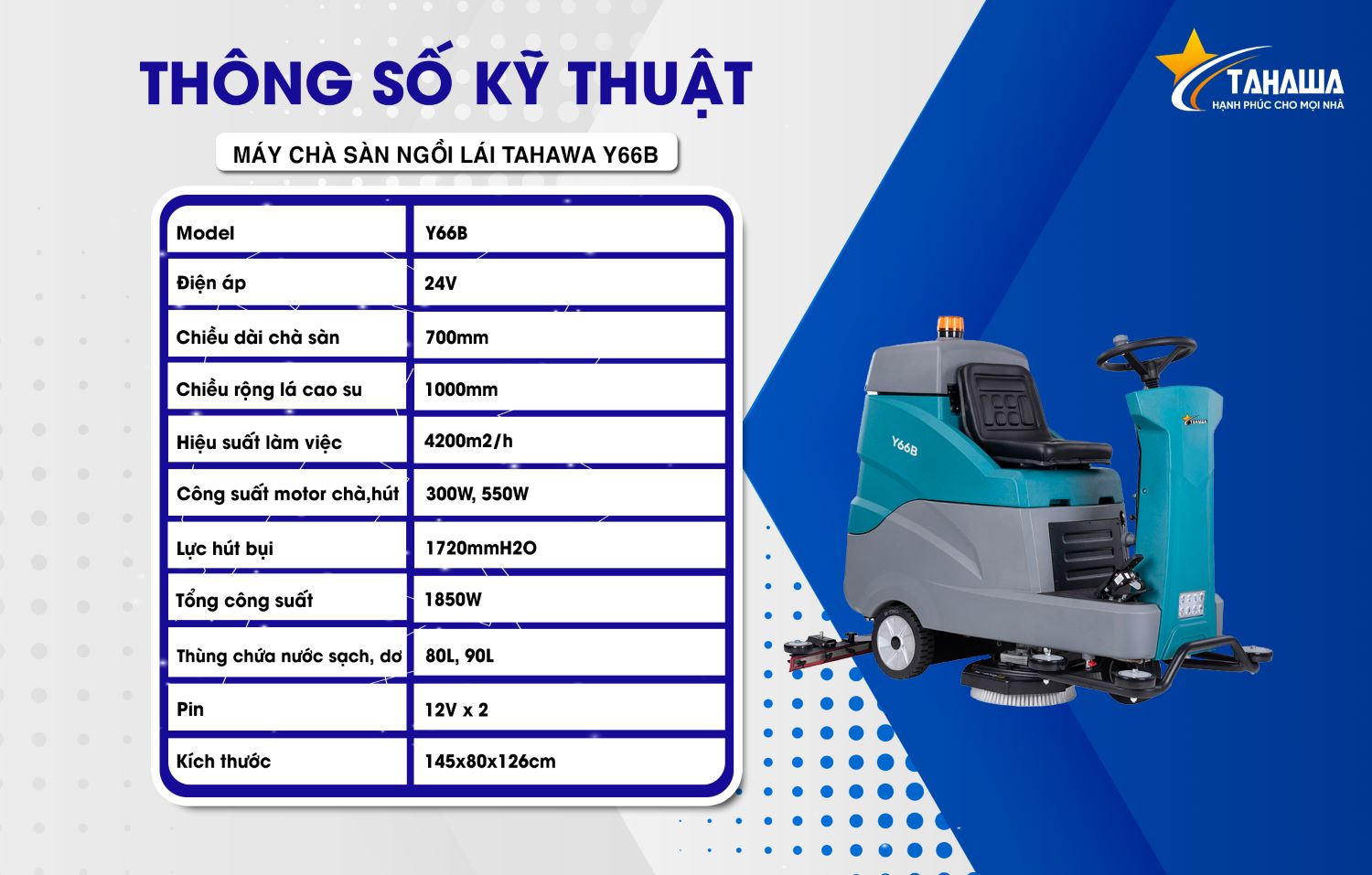 Với các thông số trên, máy chà sàn Tahawa Y66B có khả năng hoạt động mạnh mẽ, bền bỉ, phù hợp với nhu cầu sử dụng trong các khu vực có diện tích lớn, yêu cầu vệ sinh kỹ lưỡng.