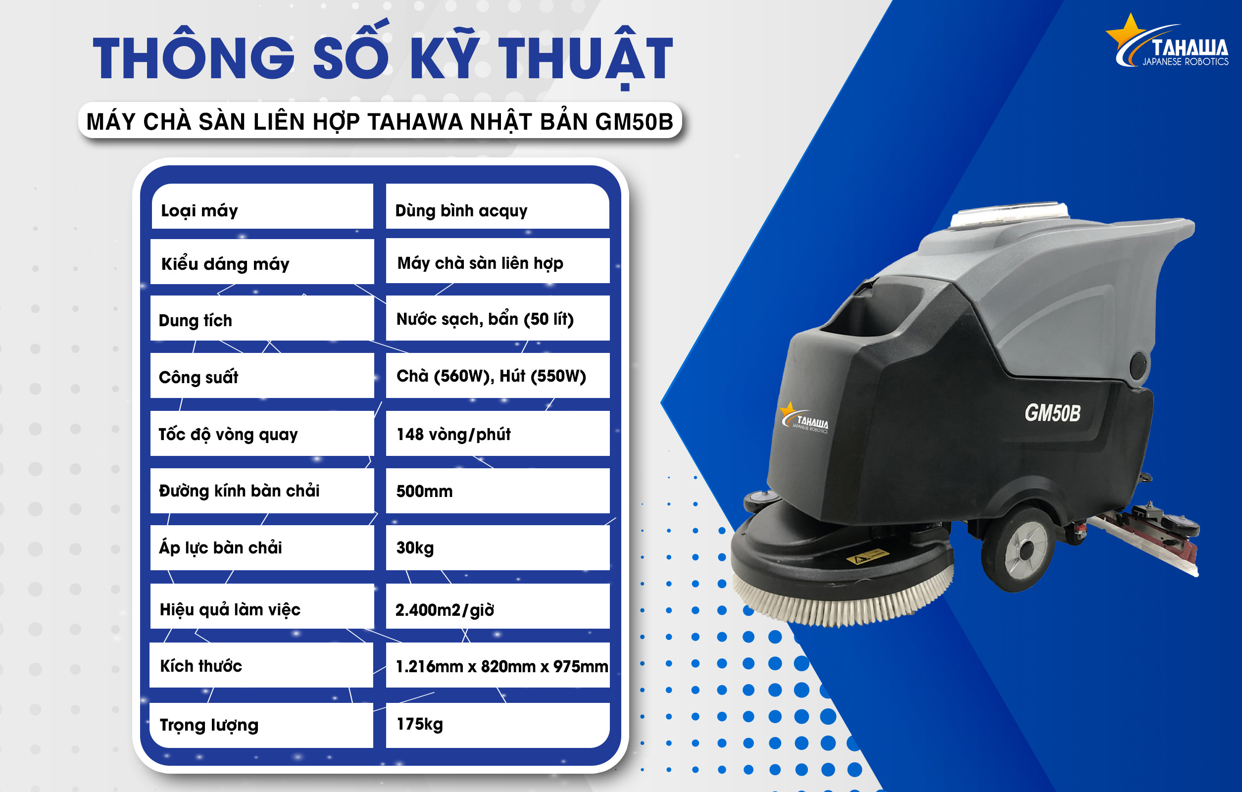 Máy chà sàn liên hợp Tahawa Nhật Bản GM50B thuộc dòng máy lau sàn thế hệ mới có nhiều cải tiến đem lại khả năng lau chà sạch mọi vết bẩn.
