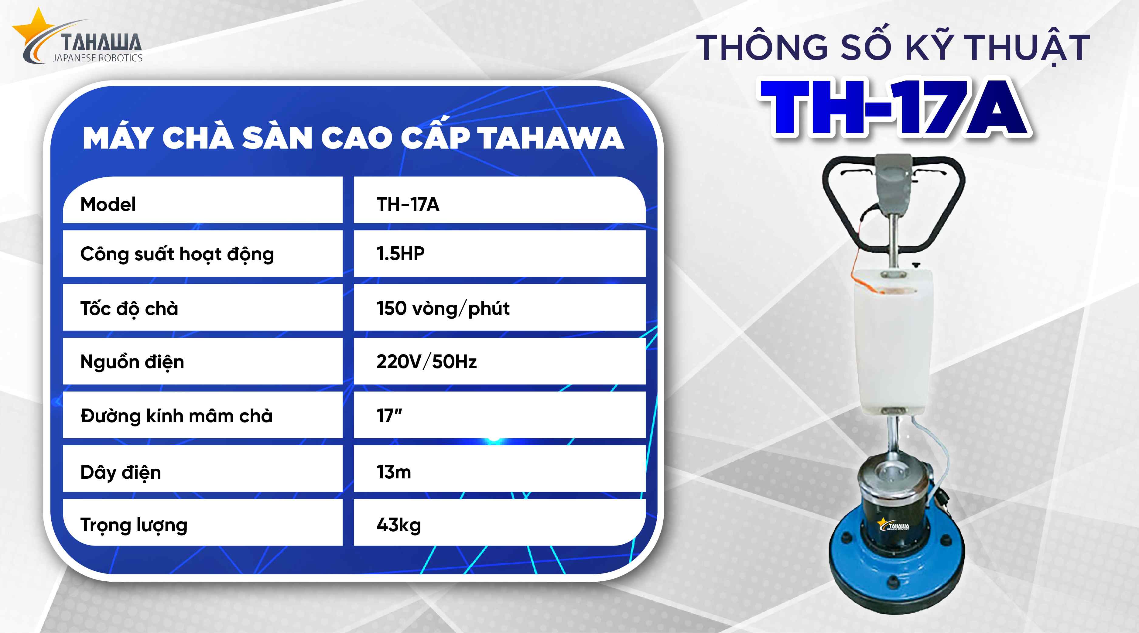 Máy chà sàn Tahawa TH-17A là một trong những sản phẩm được được quan tâm bởi các đơn vị cung cấp dịch vụ vệ sinh công cộng. TH-17A là sản phẩm bán chạy nhất vì công suất khỏe, hiệu quả tốt và giá bán hợp lý. Chuyên dùng để chà rửa, vệ sinh sàn nhà, giúp bề mặt sàn sạch sẽ, sáng bóng như ban đầu.