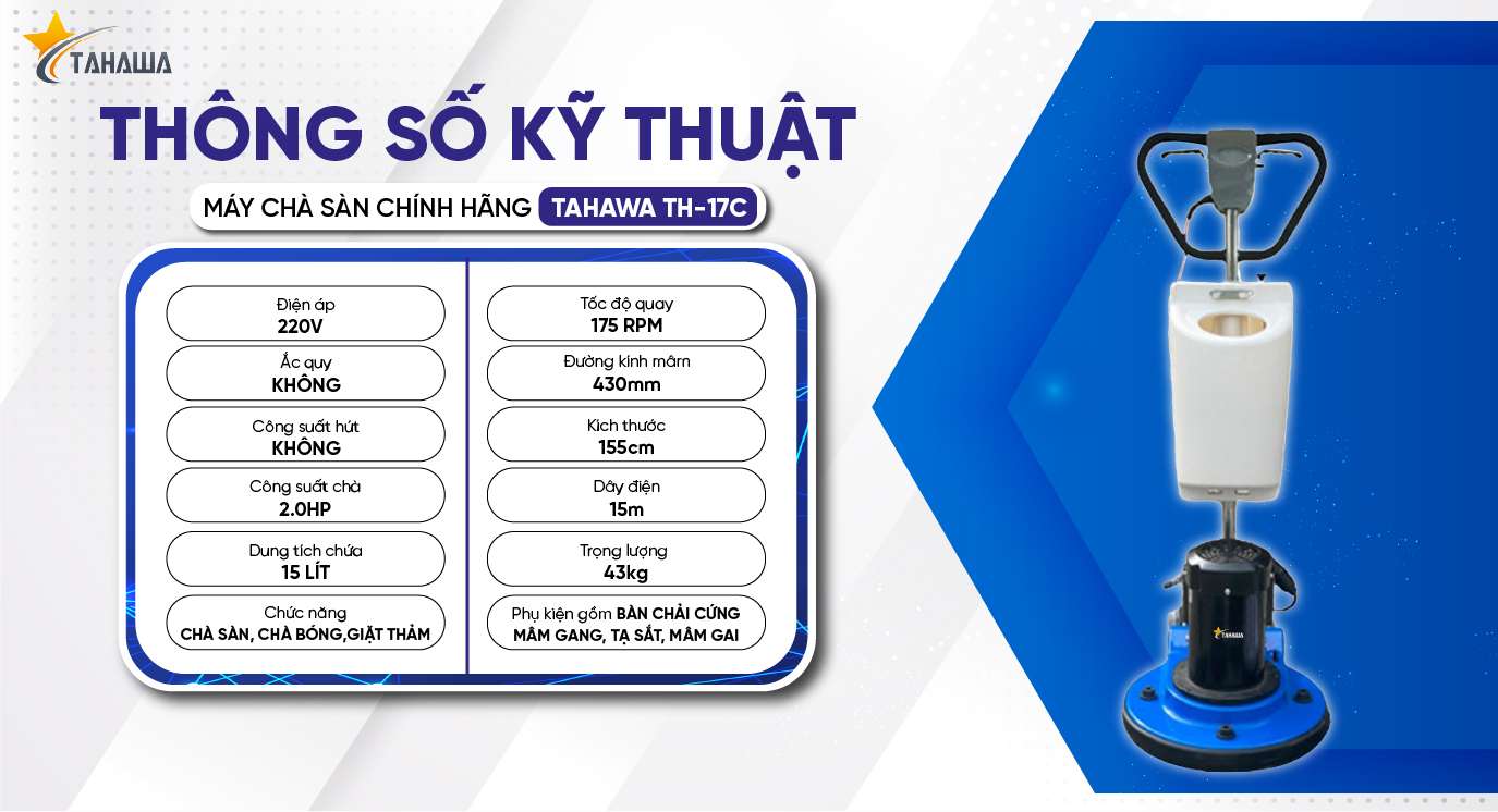 Máy đánh bóng sàn đá Tahawa TH-17C là dòng máy chà sàn công nghiệp được nhiều đơn vị lựa chọn sử dụng vì sở hữu những ưu điểm nổi bật phải kể đến như: