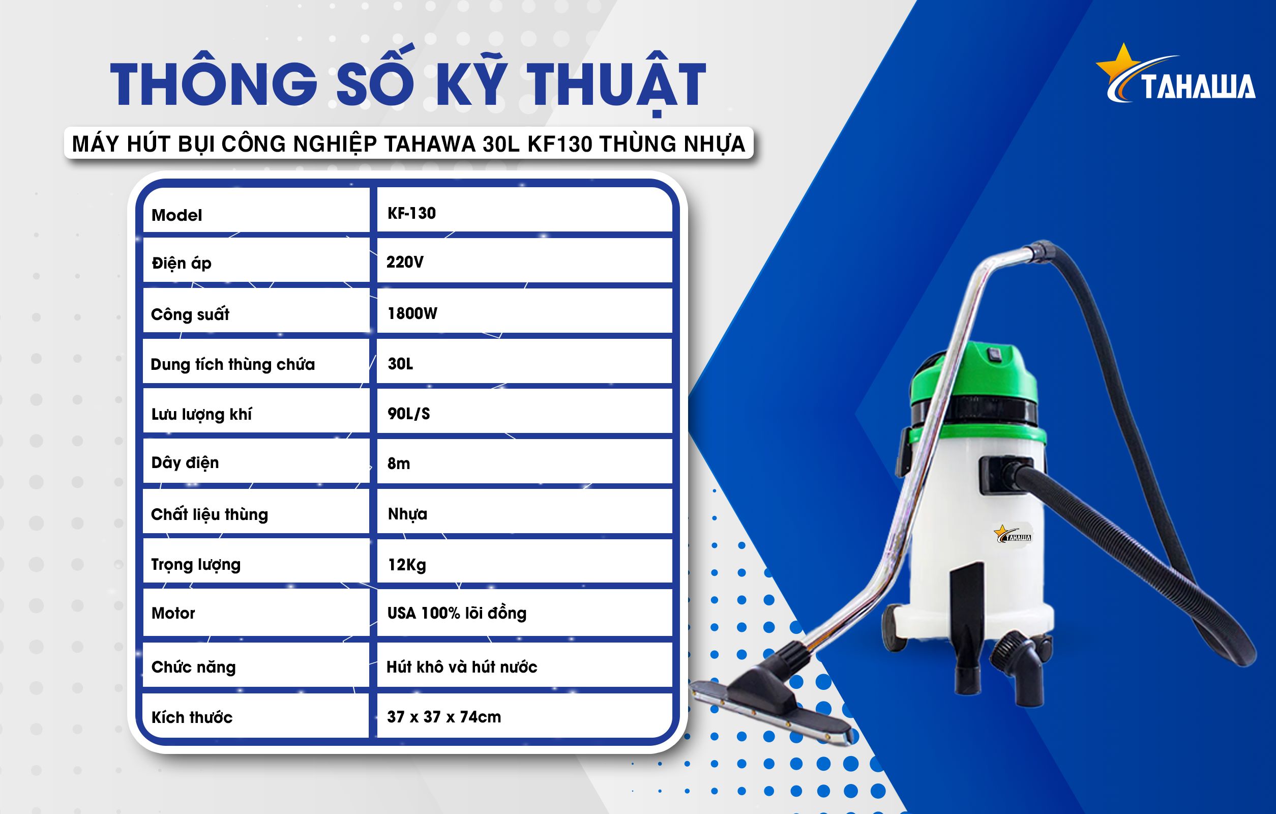 Nếu bạn đang tìm kiếm một chiếc máy hút bụi đa năng, Tahawa KF130 là một lựa chọn tuyệt vời. Với công suất 1800W và lưu lượng khí 90L/S, máy có thể hút sạch bụi bẩn một cách nhanh chóng và hiệu quả. Đặc biệt, máy có thể hút cả khô lẫn ướt, nên bạn không cần phải lo lắng về việc sử dụng máy trong những ngày mưa hay khi vệ sinh nhà tắm. Với dung tích thùng chứa 30L ( 30 lít ), bạn không cần phải thường xuyên thay thế túi lọc, tiết kiệm thời gian và công sức của bạn.