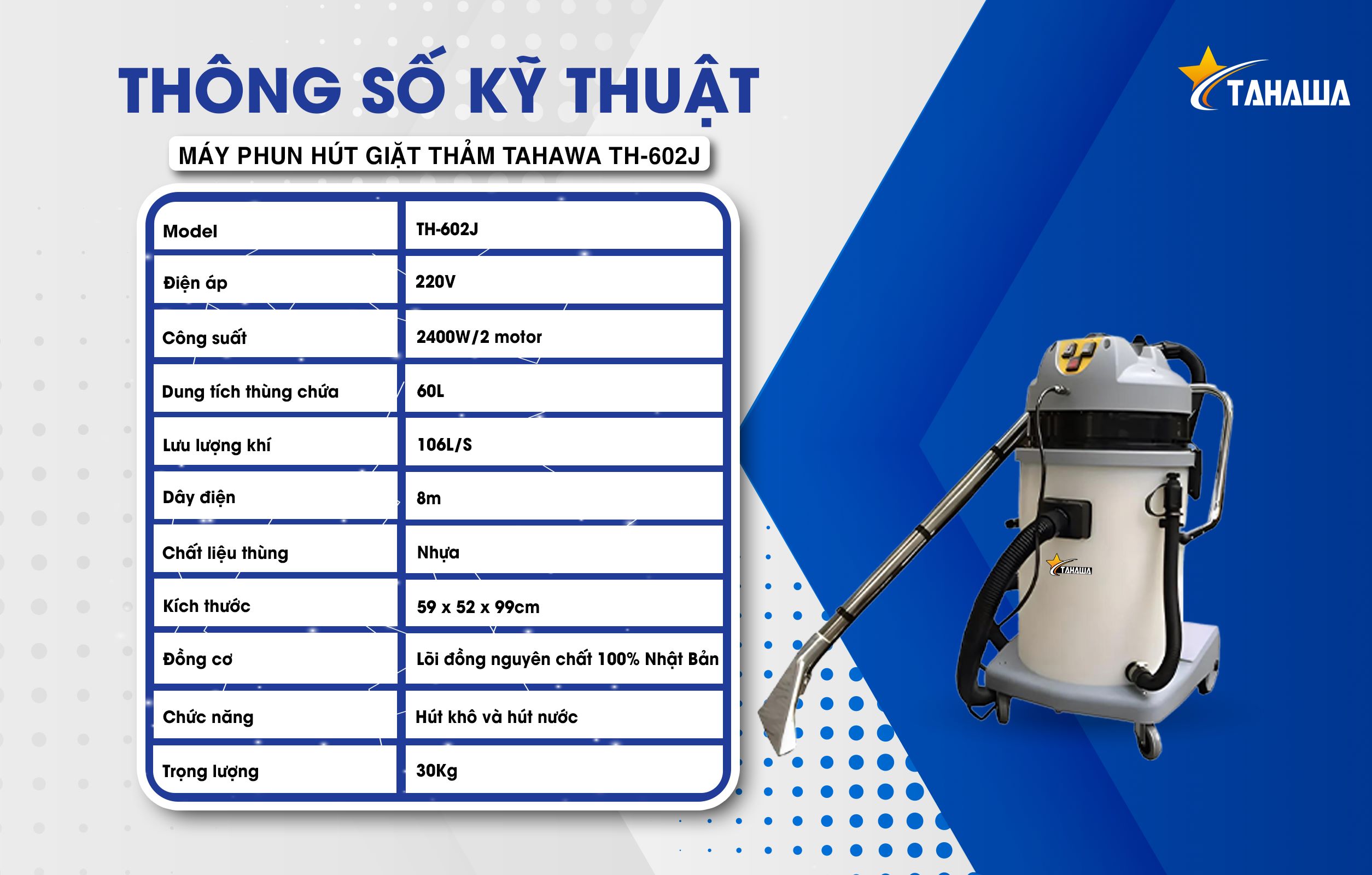 Máy phun hút giặt thảm Tahawa TH-602J là một sản phẩm được trên dây chuyền công nghệ Nhật Bản hiện đại. Với công suất lớn, hút bụi mạnh mẽ, thùng chứa cực khủng. Máy phun hút giặt thảm là sản phẩm mới, chuyên gia vệ sinh cho các nhà hàng, khách sạn, tiệm giặt là, bệnh viện.