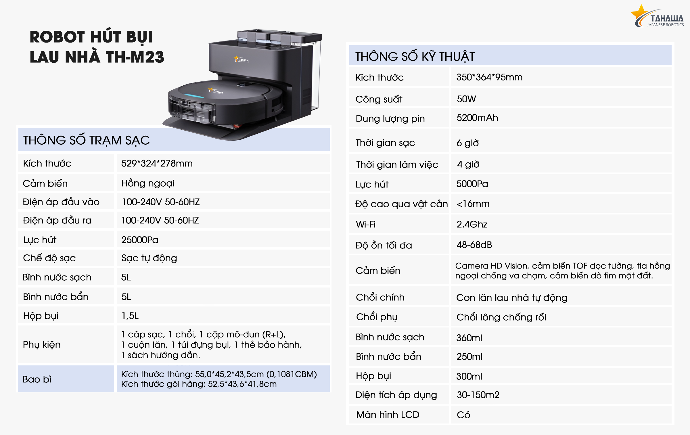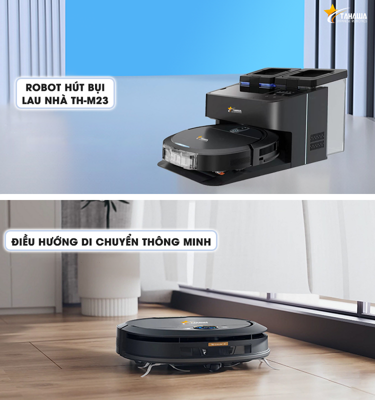 Robot hút bụi lau nhà tự giặt giẻ Tahawa TH-M23 Công nghệ USA tự động giặt giẻ, tự đổng đổ rác, tự động cấp và xả nước, thiết kê siêu gọn, model hot 2023, phiên bản Quốc tế. Phân phối chính hãng