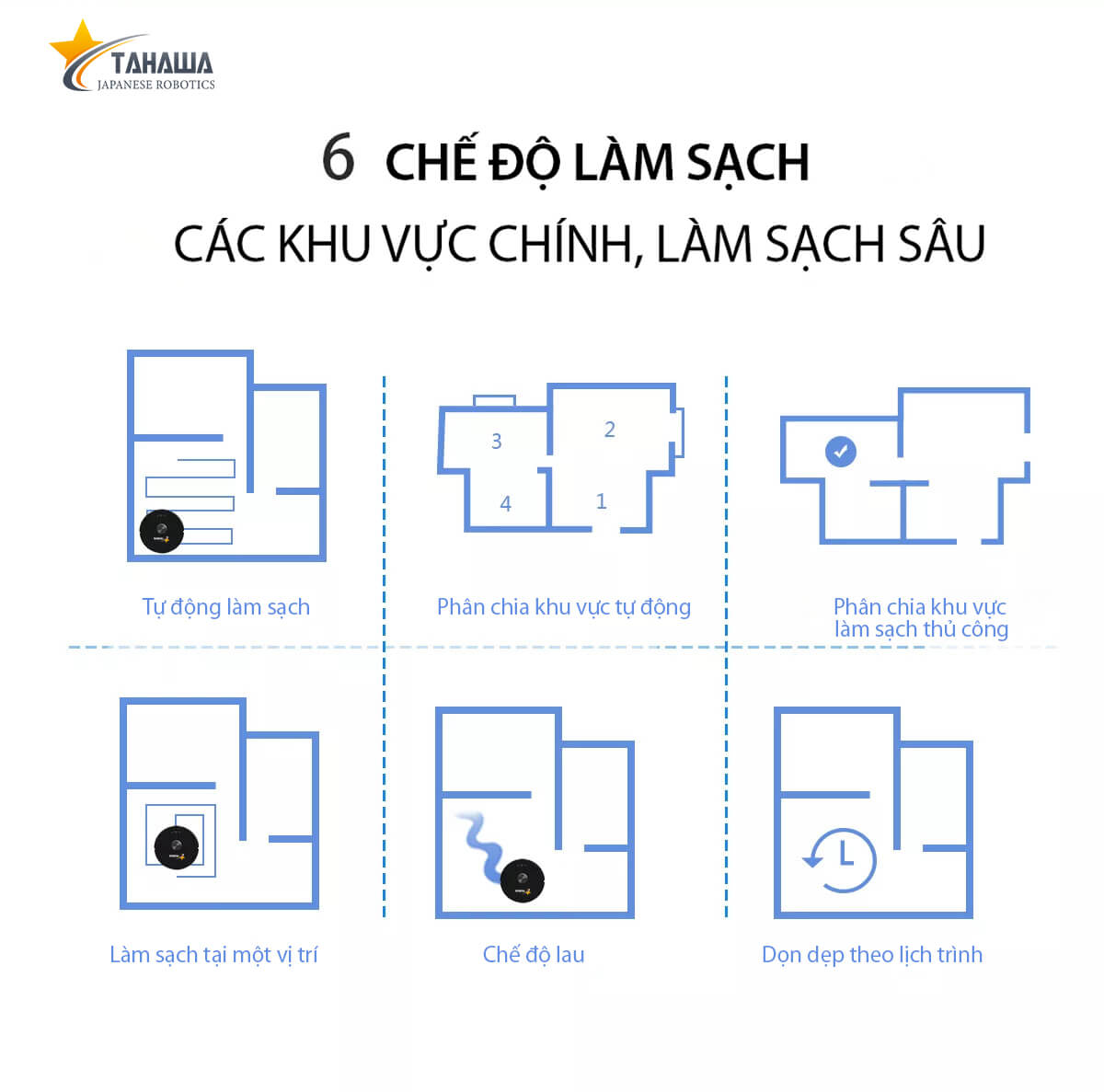 Chế độ làm sạch: tự động làm sạch, làm sạch góc cạnh, làm sạch tại điểm, dọn dẹp thủ công, robot hút bụi Tahawa TH-07XR hứa hẹn sẽ đem lại cho bạn những trải nghiệm tuyệt vời và là sự lựa chọn đúng đắn so với các mẫu robot hút bụi trong tầm giá.