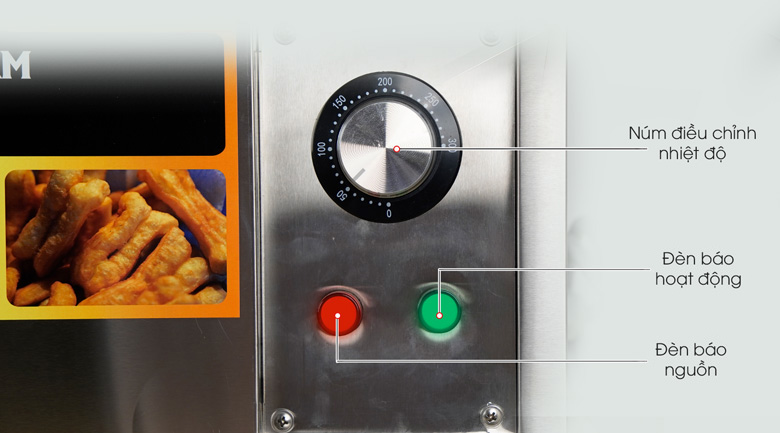 Hệ thống điều khiển của bếp CY12 được thiết kế tiện lợi với nút vặn cơ và các đèn báo trạng thái. Người dùng có thể dễ dàng điều chỉnh nhiệt độ trong dải 50 - 300°C, phù hợp với từng loại thực phẩm cần chiên.