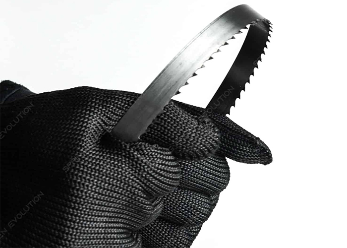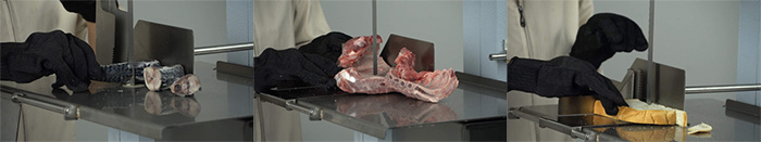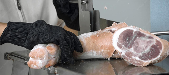 - Bước 4: Đeo găng tay, đặt miếng thịt/xương lên bàn cắt, sử dụng thanh đẩy để đưa miếng thịt/xương vào lưỡi cưa.