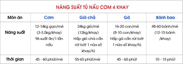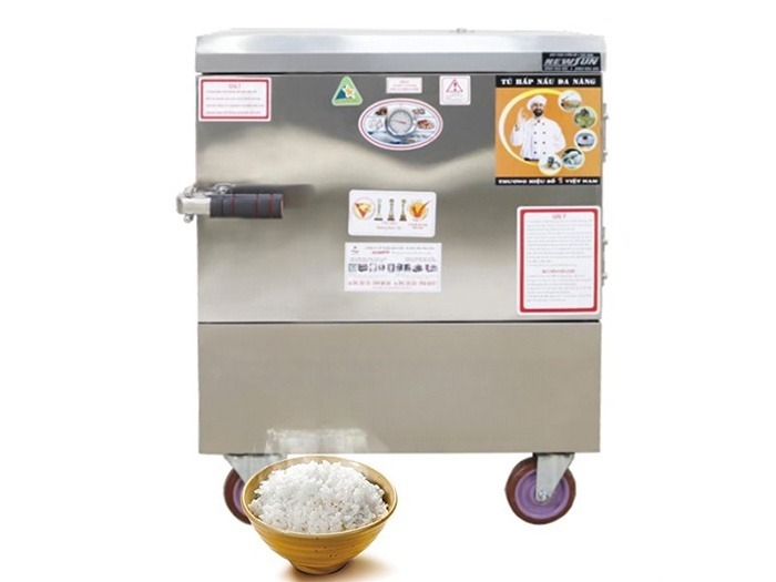 Tủ nấu cơm 4 khay được thiết kế để nấu lên đến 16kg gạo chỉ trong khoảng 45 - 60 phút. Điều này giúp tiết kiệm thời gian và công sức đáng kể so với các phương pháp nấu truyền thống. Không chỉ dùng để nấu cơm, tủ còn có thể hấp giò chả, xúc xích, rau củ, hải sản, gà vịt, bánh bao và nhiều loại thực phẩm khác. Đây là giải pháp lý tưởng cho các bếp ăn cần phục vụ đa dạng món ăn với năng suất cao.