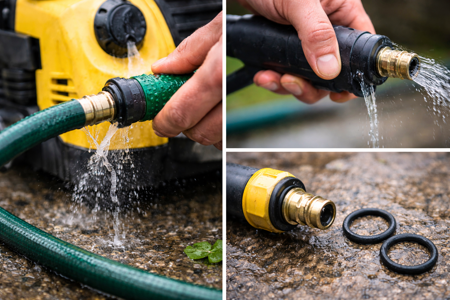 Máy lên áp kém đôi khi không phải vì thiếu lực, mà vì áp bị “xì” ra ngoài. Bạn nên kiểm tra các điểm nối: đầu vào nước, đầu ra cao áp, khớp nối dây, khu vực tay súng. Nếu thấy rò nước, hãy kiểm tra gioăng O-ring có bị mòn hoặc nứt không. Thay gioăng đúng cỡ thường giải quyết được tình trạng áp tụt và máy kêu bất thường khi chạy.
